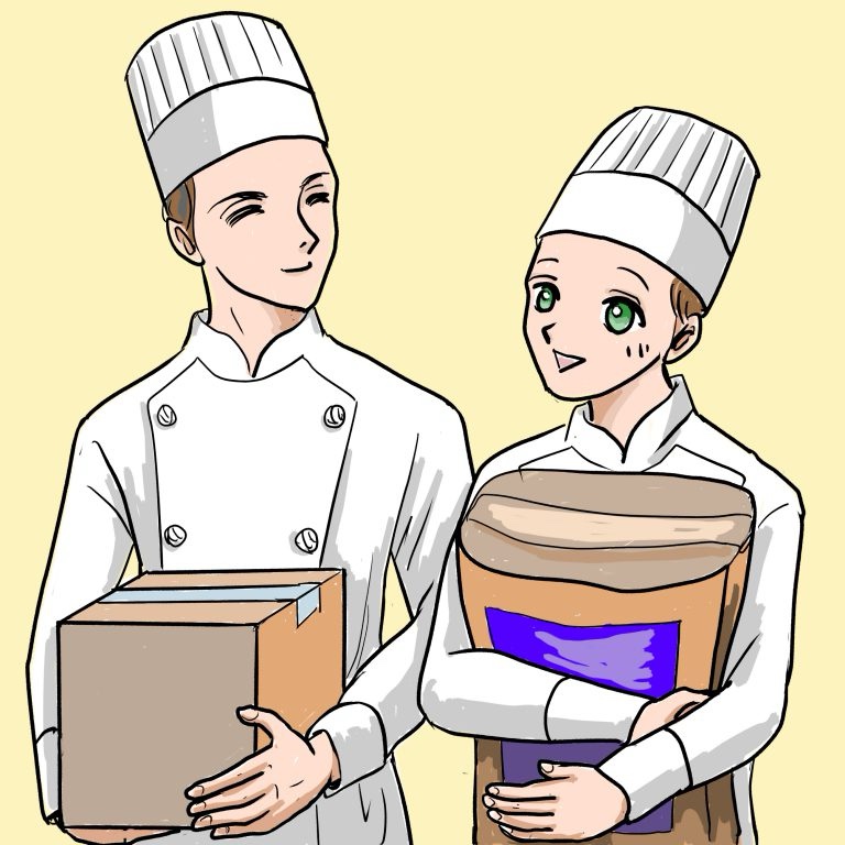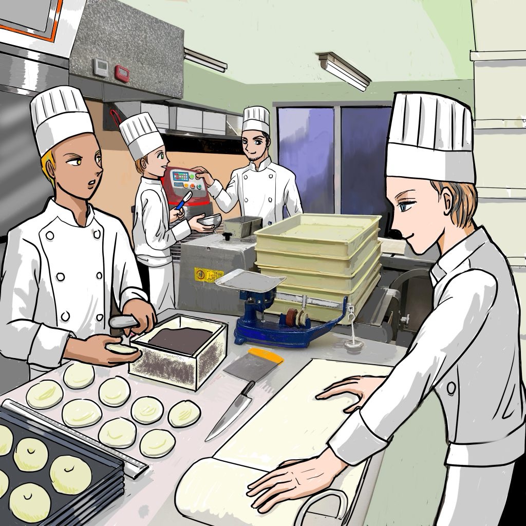 「そう!あれ取ってくれよ」藤岡はクロワッサンを成形しようとしている。ナイフは持っているので杉本の手元にある定規が欲しい。