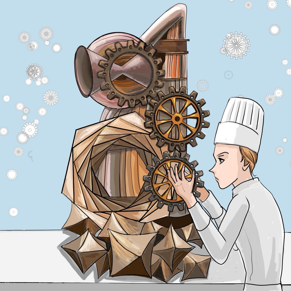 その隣のブーランジェリー秋山の萱島大吾は故郷の岡山県英田郡西粟倉村影石にある水力発電に思いを馳せ、水の勢いを表現していた。