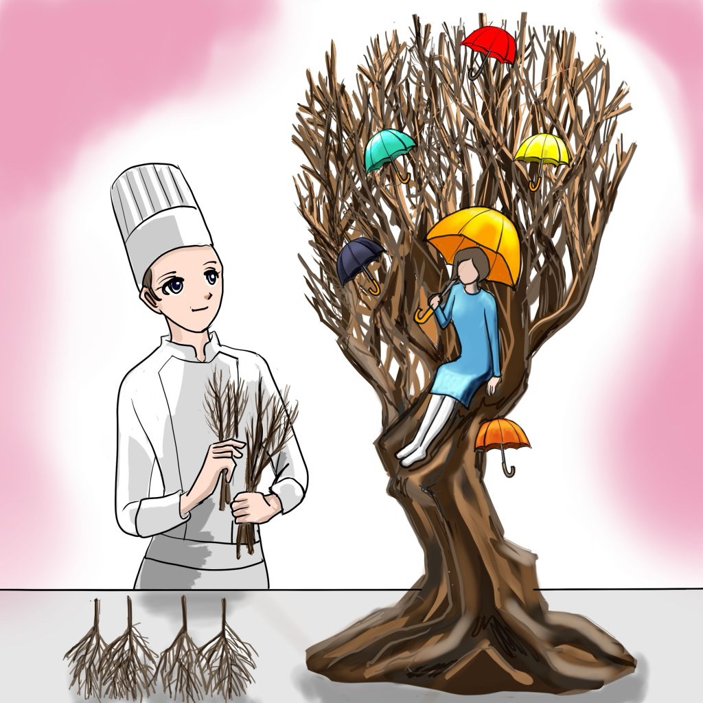 一番左のブースのパン工房エクラの寺阪明穂は、女性らしい感性で雨の降る日、木の上で雨宿りする女の人を表現した。ありきたりの様だがパンで細かく木の枝が作られており、なかなかの力作だ。