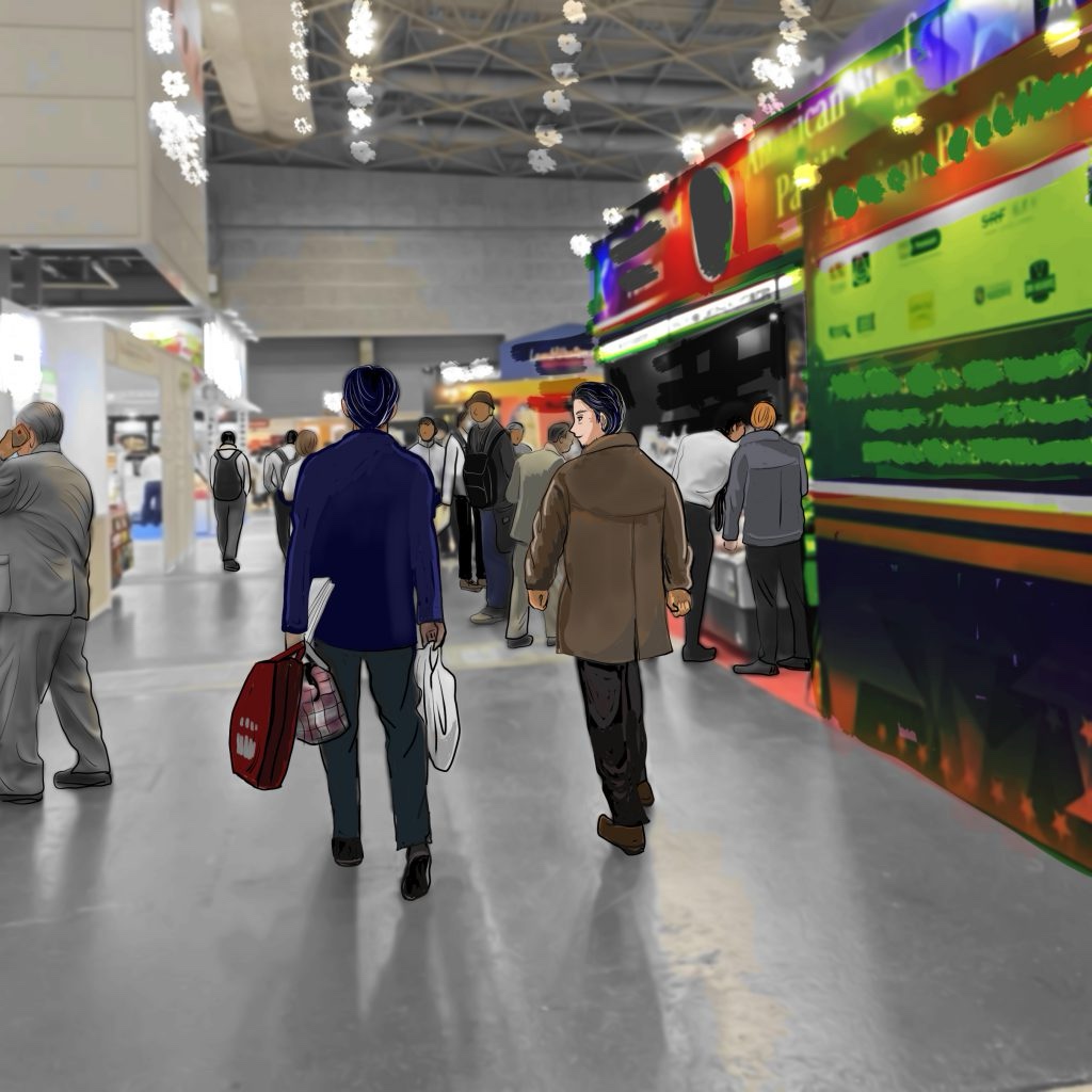 そのあと会場を練り歩いてあのブースは包材屋さん、あのブースは機械屋さんとかひとつひとつ見ていったがどこも明日の開会までにセッティングを終わらせなければならず目が血走っている。
