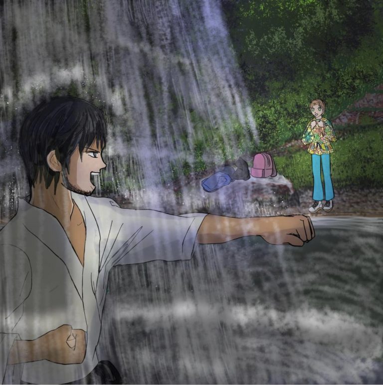 「ヒーっ」と叫んで纏わりつく蚊を避けるために滝に飛び込んだ。