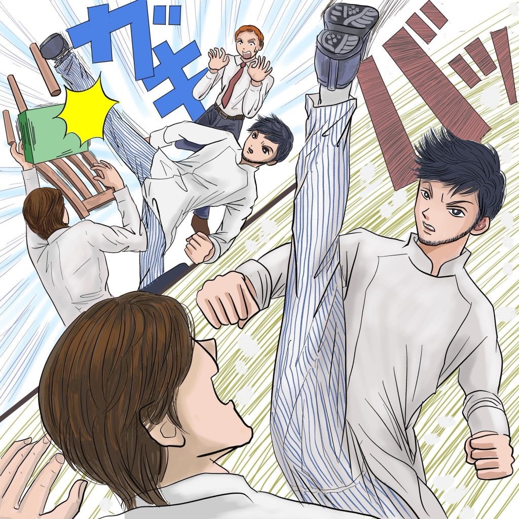 1人目は「うがっ」と脇腹を押さえながらよろよろ立ち上がり、椅子で殴りかかってきたので、後ろ回し蹴りで椅子を壊して振り向き様に踵落としを決めた。