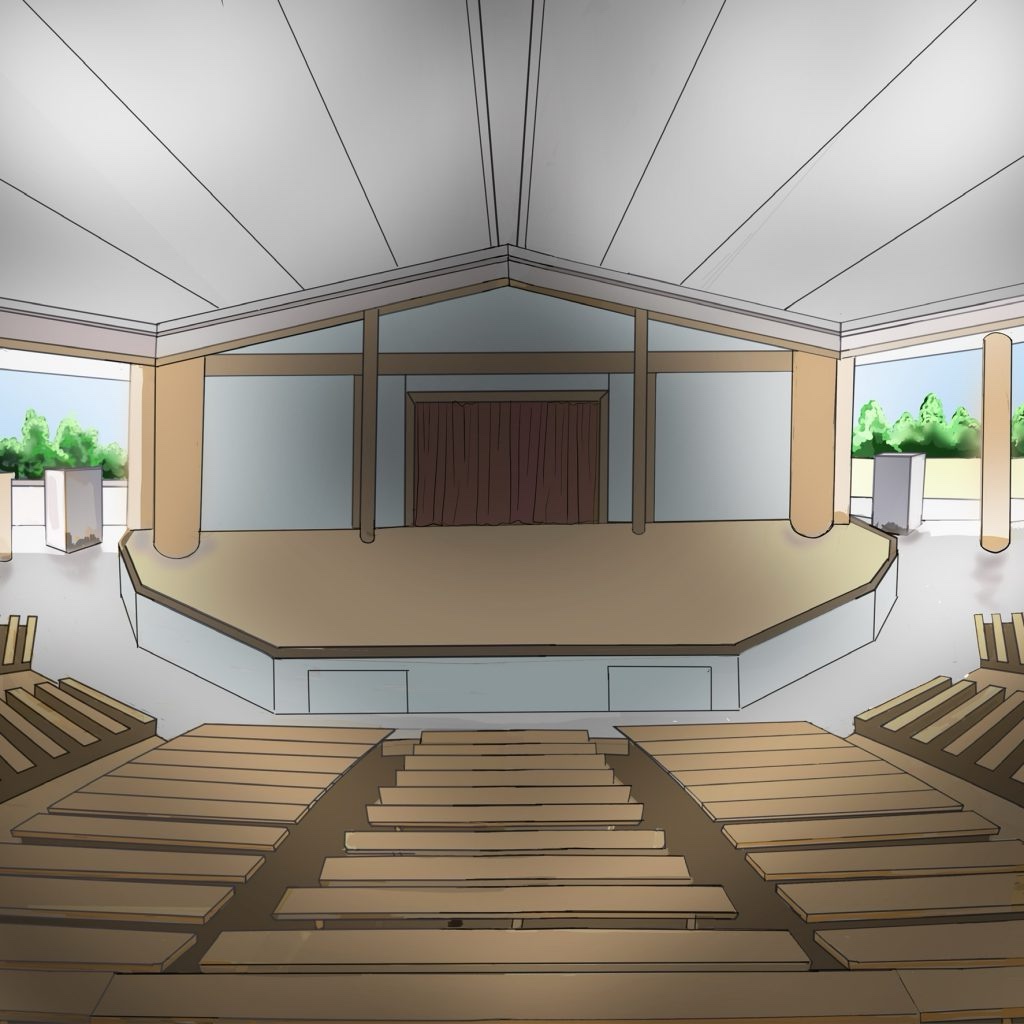 イベント会場は公会堂の外にあり、舞台と観客席がある。その上の大きな屋根は白いテントでできている。仮設ではないのでそこでは度々音楽ショーや野外映画会などが行われている様だ。