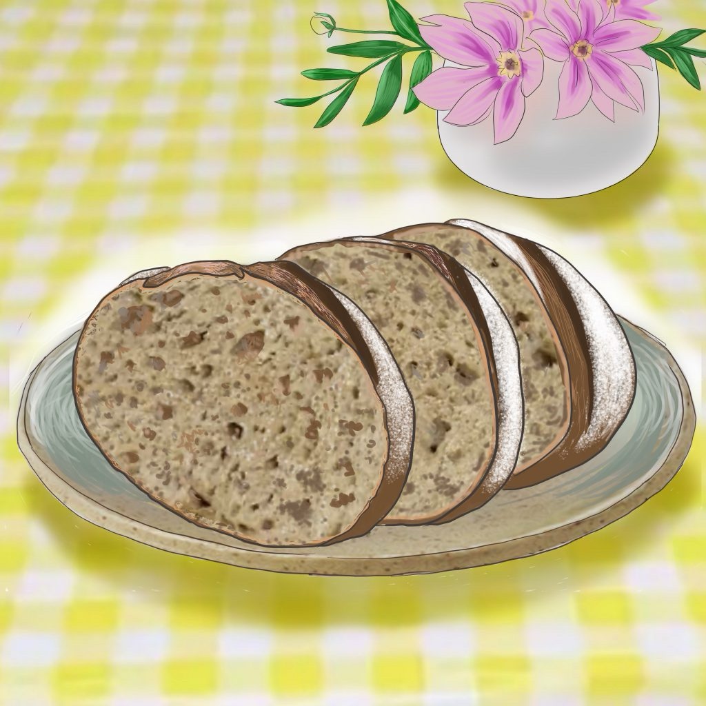 色々と迷っていたらしいので、修造はSAUERTEIG-ROGGENBROT MIT FRÜCHTEN UND NÜSSENと言うフルーツとナッツの入ったライ麦パンを選び、岡田にパン切り包丁とまな板を貰ってテーブルで薄くカットして一切れ渡した。グレーブラウンの生地の断面にはアプリコットやアーモンドとヘーゼルナッツ、その他のドライフルーツ、オーツ麦フレーク、亜麻仁などが鮮やかに見て取れる。