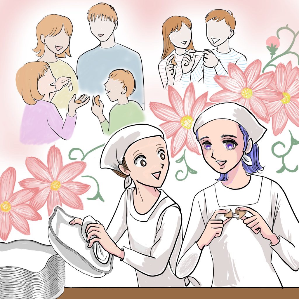 「風花ちゃんこれ、お客さんにひとつずつ渡してね」奥さんは焼けたフォーチュンクッキーを可愛いカゴに入れて、レジでパンを買ったお客さんに渡す様に言った。