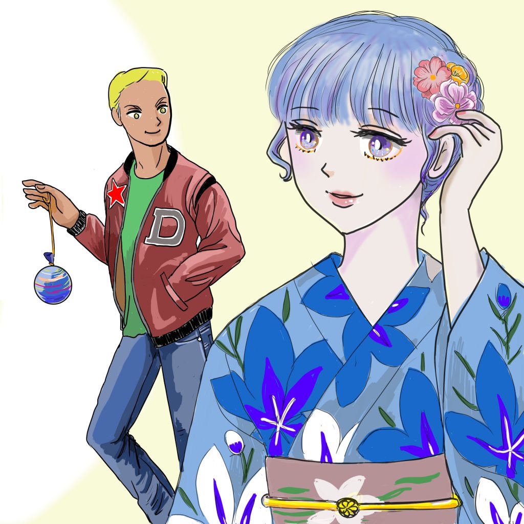 浴衣より少し厚めの紺色の生地に桔梗が描いてある大人っぽい柄の着物に、淡い紅色の帯と髪留めをあしらった。黄色いバッグに白い足袋と赤い鼻緒の黒い下駄を履いて出かけた。