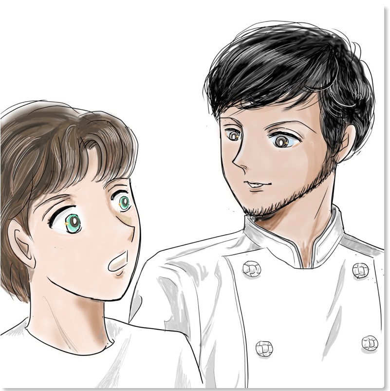 佐久間シェフは修造を見た。「ドイツで5年修業してきたそうだが、しょせん私の実力には及ばないんじゃないのか。ちびっ子が助手みたいだし。悪いが決勝でも私が勝つよ」