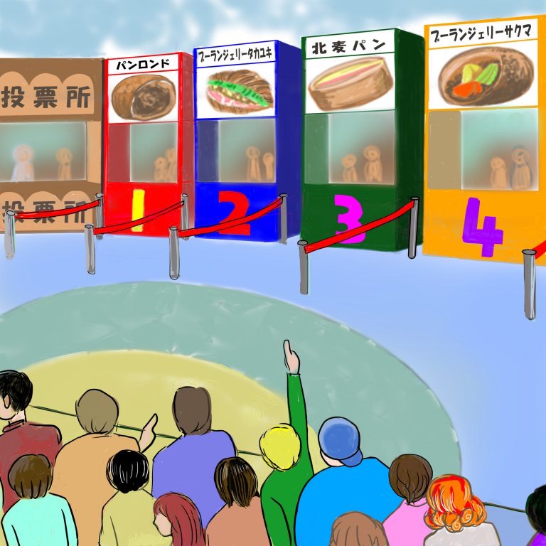 300人のお客さんは行きたいパン屋のパンから食べて行き、4種類のパンの中から1番と思うものに投票していった。