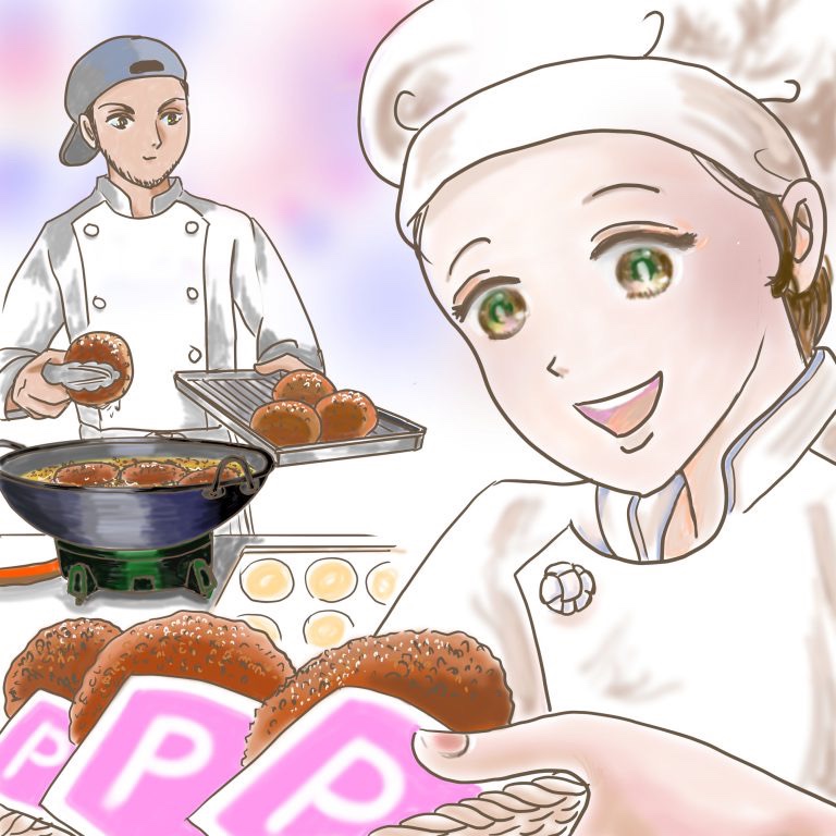 そろそろ終盤、パンロンド田所チームのブースでは修造が丁寧にカレーパンを揚げ続けていた。