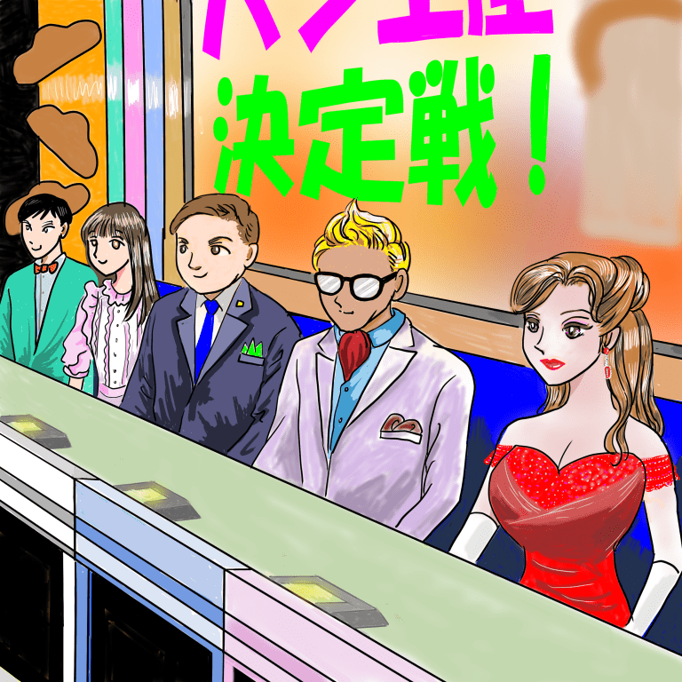「さあ!始まりました!パン王座決定戦。いよいよ決勝戦になりました。ここで審査員席の皆さんの紹介をしたいと思います。まず1番右が赤いドレスの印象的な女優の桐田美月(きりたみつき)さん、お隣が文化人の有田川ジョージさん、原料理学校校長の原隆(はらたかし)校長、アイドルの羽山裕香(はやまゆうか)さん、そしてお笑い芸人のマウンテン山田さんの5人です!」
