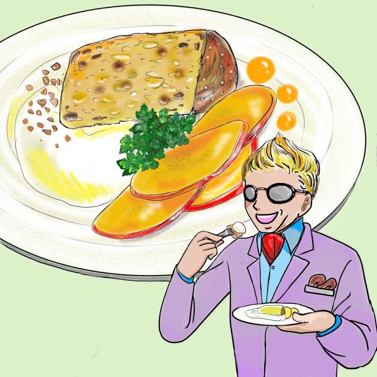 文化人枠の有田川ジョージが「オレンジの爽やかな生地とりんごのスパイスの味がソースに染みて美味しいですね。」と感想を述べた。