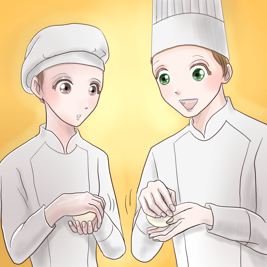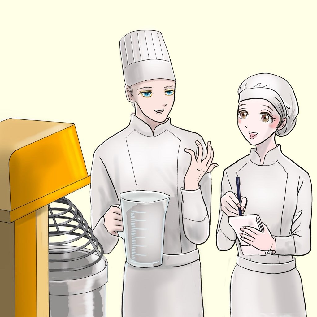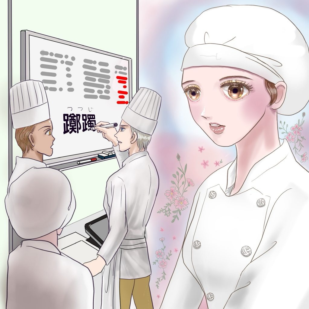 丁度ボールを抱えてホイッパーで生クリームを立てていた立花が振り向いた途端にボールを滑らせて下に落とした。ガシャーンと音がして、横にいた江川の顔にクリームがビチャっと飛んだ「きゃっ」慌てた江川は後ろにいた登野の足を踏んだ「痛い」手に持っていた天板が2枚ともバーンと下に落ちてラスクが散乱した。